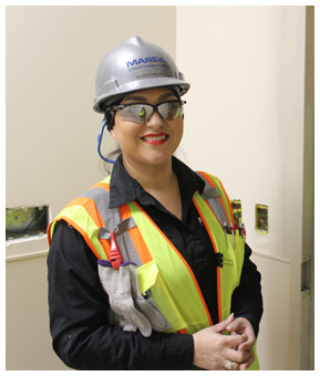 Gloria received her grey hardhat on January 9, indicating that she is now a foreman at MAREK. As a foreman, she supervises framers and sheetrockers – currently only 43 workers, but at times up to 100, depending on the project. On the current project, she is supervising the interior framing and drywalling from levels 5 through 16. She works with leadmen who each have a crew assigned to a specific task, and she makes sure all of the crews build their assigned parts correctly. She gets the inspection reports from the City of Houston between the framing and the drywalling. Her job requires a great deal of organizational skills! Saied Alavi, Managing Director at MAREK, said her job is similar to that of an orchestra conductor, making sure that all the parts work together to create something beautiful.