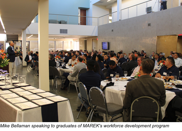 “When you’re making choices it’s about leadership and fortitude,” Bellaman told those gathered at MAREK headquarters in Houston for their annual workforce development dinner and graduation. “When you reflect back on your career or your life you remember moments and these are driven by your choices.” He talked about his own personal experiences – from the highs of playing major league baseball and running large construction firms to the lows of living in his car for a time. In all those situations, his personal choices made all the difference for good or bad.