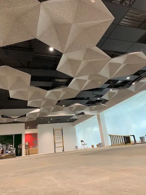 To bring this new system to life, the MAREK team relied on innovation, craftsmanship, and teamwork. They began by developing custom cardboard templates cut to the exact dimensions of the SoundStar baffles. Using drawing reference points, the crew spray-marked layout lines directly onto the ceiling plane, ensuring accuracy across the space. Multiple templates were used to improve speed and consistency. Once the layout was established, the team designed a suspension system that would allow the baffles to float securely beneath the acoustic ceiling. To navigate mechanical obstructions, they fabricated support tees and trust structures using framing materials, creating solid anchor points for the cables.