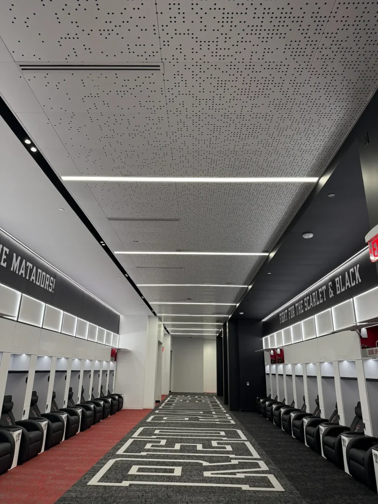 Texas Tech University set out to build a world-class athletic facility that would enhance the student-athlete experience and energize fans on game day. The South Endzone – Womble project combines bold design with complex technical requirements, including custom perforated ceilings with integrated linear lighting installed at heights exceeding 14 feet. With materials ordered before final field measurements, precise coordination and communication were essential to meet the demanding two-year construction schedule.